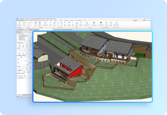 Asimismo, GstarBIM genera modelos de terreno 3D a partir de puntos de elevación, curvas de nivel o datos importados, y admite la importación de terreno de Google Maps y el intercambio de datos .kmz con Google Earth.