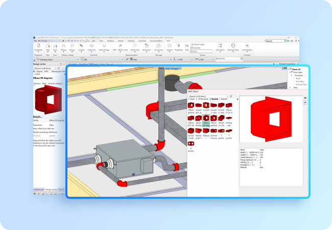 El módulo de diseño MEP integrado facilita el diseño de sistemas de climatización, cableado eléctrico y fontanería, calculando automáticamente el trazado, generando tuberías, insertando accesorios y permitiendo la rápida finalización de diseños complejos.