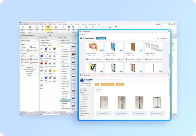 La integración de AL Warehouse y Trimble 3D Warehouse permite la descarga directa de componentes para su uso. El sistema admite más de 50 formatos de archivo, incluyendo .skp, .rfa y .3ds, y permite la importación o exportación por lotes de componentes, lo que facilita la migración y el uso compartido de archivos de bibliotecas de componentes y materiales.