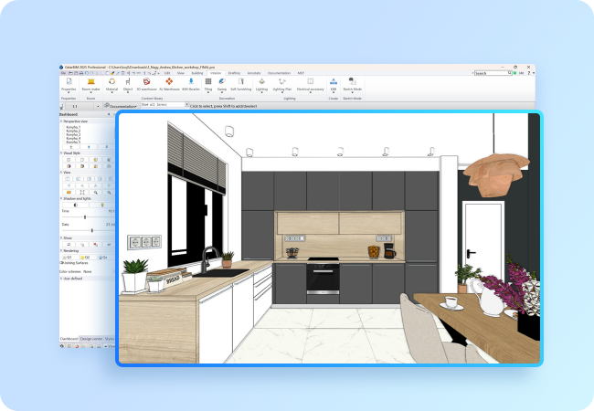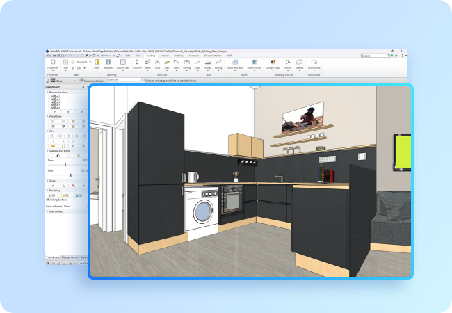 Proporciona herramientas para muebles paramétricos personalizados, alicatado inteligente, iluminación y techos, lo que facilita un flujo de trabajo completo de diseño de interiores, desde los planos hasta la renderización 3D. El flujo de trabajo incluye simulación en tiempo real de materiales, colores e iluminación, y genera datos de diseño precisos, listas de materiales y estimaciones de costos, lo que permite un diseño de interiores eficiente y consistente.
