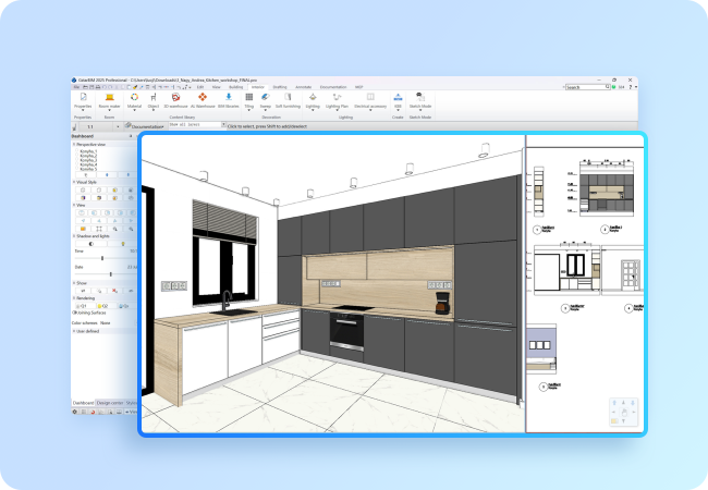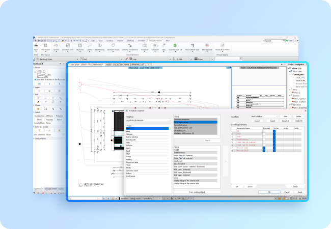 Proporciona una extensa biblioteca de símbolos estándar con colocación inteligente de etiquetas para habitaciones, bloques de título altamente personalizables vinculados a los parámetros del proyecto y permite la generación automática de vistas de alzado de muros interiores con anotaciones precisas de dimensiones.